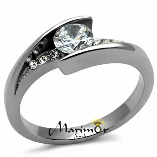 Made of solid stainless steel and a high polished finish (no plating). This ring features a. 84 carat (6mm) round brilliant cut solitaire stone in a tension setting, accented by six (1mm) round cut stones in a pave setting.